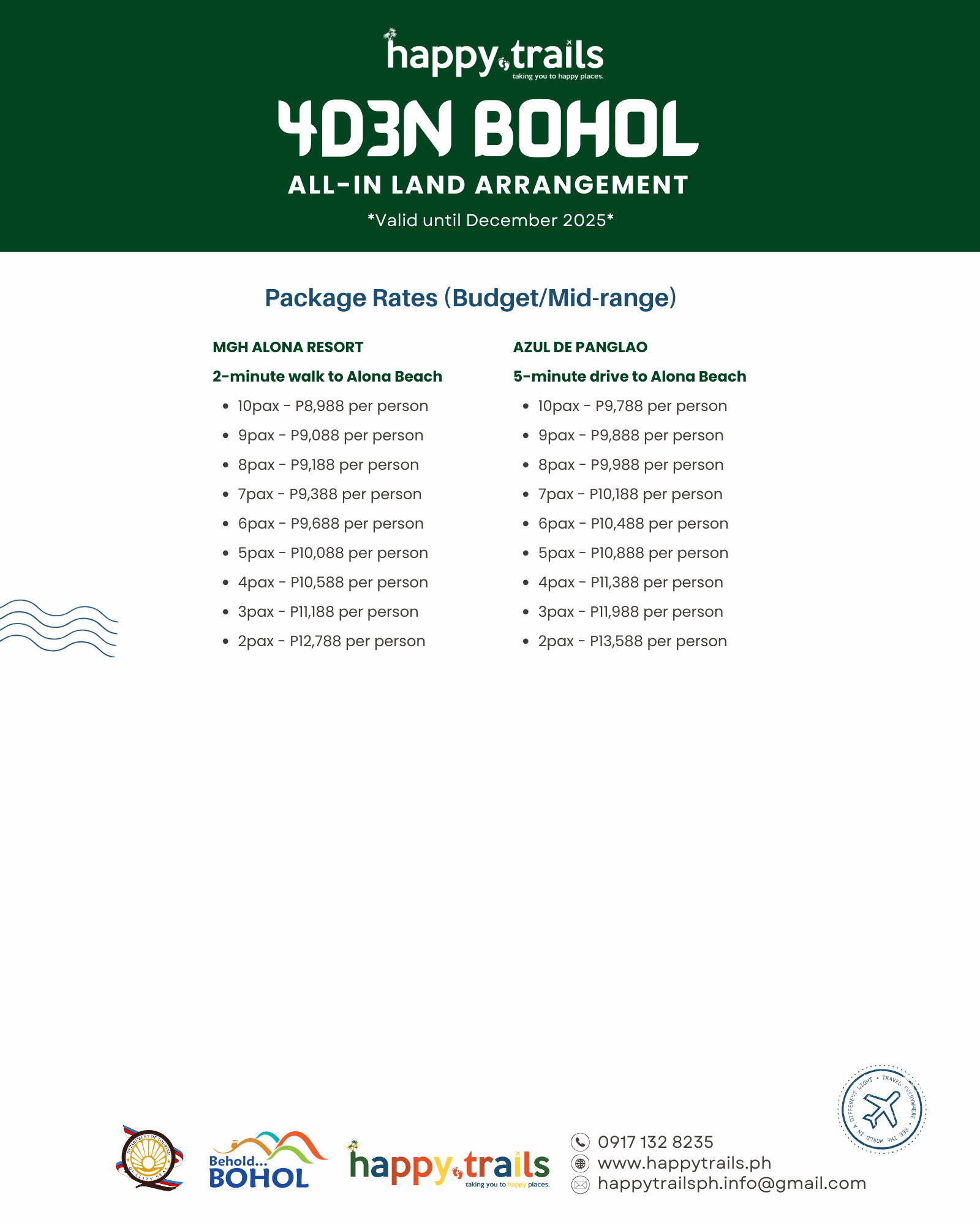 4 Days 3 Nights Chat With a Live Agent Let us take you to more happy places. Request a quote. Name Contact Number Email Address Tour Package/s Tour Package/sAll-in Bohol Countryside TourCountryside + Abatan Firefly TourCountryside + Danao Adventure ParkDanao Adventure ParkHalf-Day Panglao Land TourPanglao + Abatan Firefly TourScenic Candijay TourFarm & Firefly TourAbatan Firefly Watching TourCustomized ToursCustomized Tours with Accommodation Number of persons Travel Date/s Notes/Special Requests 1 + 6 = Submit